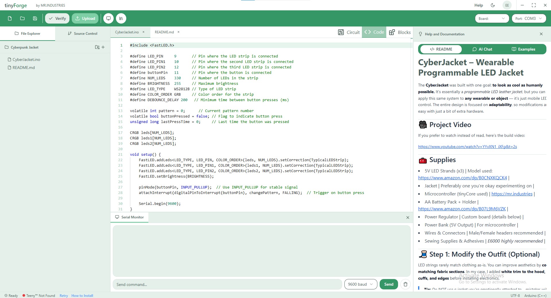 Our browser-based coding and circuit design tool, tinyForge, is almost ready for beta. We've begun the final integrations of the Arduino CLI and USB Serial communications into the software. I'm very excited for users to get their hands on it. We're aiming for a beta release before the end of the year. Early adopters will get priority access to this, and lifetime access as a thank-you for supporting the project!